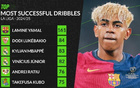 本赛季西甲成功过人榜:亚马尔161次高居榜首,姆巴佩第三